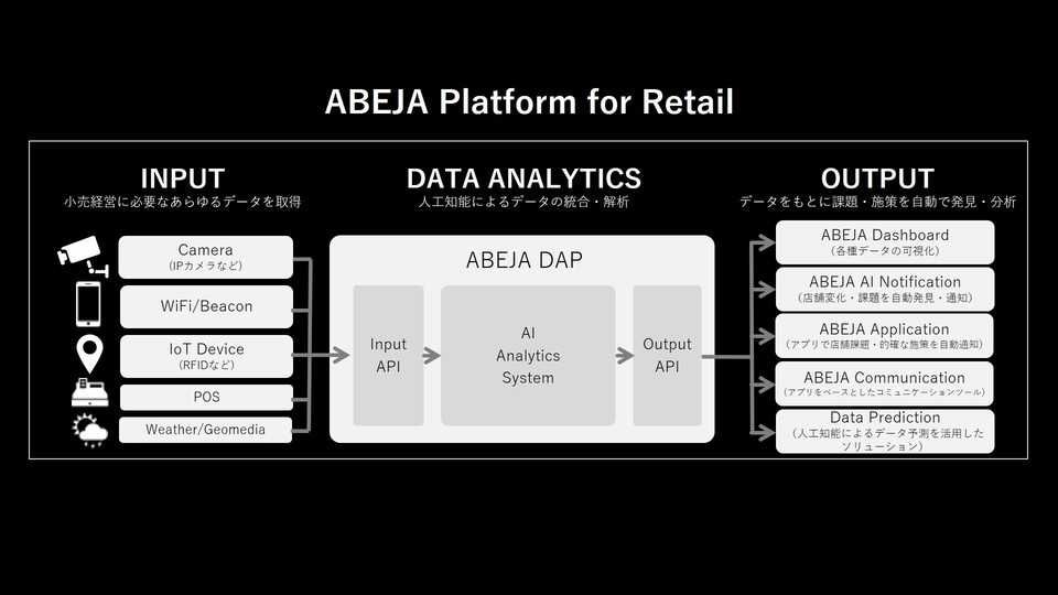 そもそも私たちABEJAはAIのブレークスルー技術である「ディープラーニング」を活用した解析プラットフォーム「ABEJA Platform」を提供する企業です。このプラットフォームを活用したサービスとして実店舗におけるさまざまな情報を収集・解析・可視化する「ABEJA Platform for Retail」を小売企業さまに提供しています。