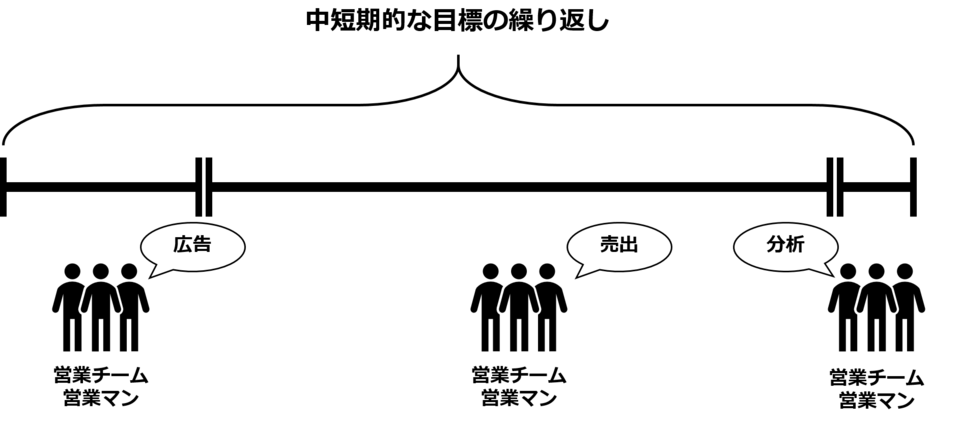 たとえば、営業パーソンが自分に合った営業戦略手法(戦術)を考える場合もあり、チームや全社で共通の手法を採用し、短いサイクルでPDCAを回すこともあります。