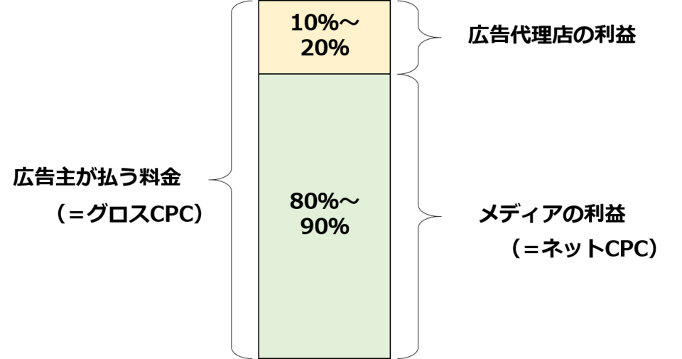 クリック課金型広告で料金が発生すると、広告代理店が10~20%の手数料を引いて、掲載メディアにWeb広告掲載料を支払います。