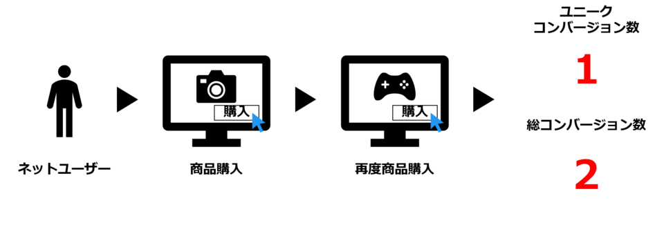 つまり、ユニークコンバージョンとの明確な違いは、同一ユーザーの2回目の購入をカウントするか否か、という点です。