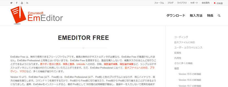 Emeditor Professionalは、軽量で高速、拡張性の高いWindows用の有料テキストエディタです。「世界でもっとも速いテキストエディタ」と評されており、最新のスニペットや高機能マクロ、容量の大きなファイルを使うための機能を実装しています。顧客サポートも丁寧で、世界中の企業や公的機関で導入されています。