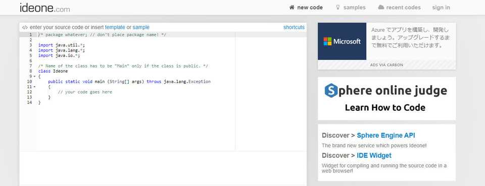 Ideone(イデオン)は、オンライン上でプログラミングを実行できるサイトです。プログラムコードを入力し「Run」ボタンでコンパイルと実行を行います。「C」「C++」「Java」「Python」「latex」など、さまざまな言語に対応しており、ユーザー登録なしですぐに実行できるのでプログラミングの学習には最適な環境といえるでしょう。