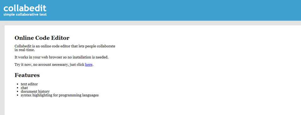 collabedit(コーラ エディット)も、オンラインのコードエディターですが、ほかのプログラマーとチャット機能を使ってリアルタイムでコミュニケーションをとりながら共同編集が可能なのが特徴です。さらにプログラミング言語をハイライト表示できる機能もあるので、さまざまなプログラマーが活用しています。