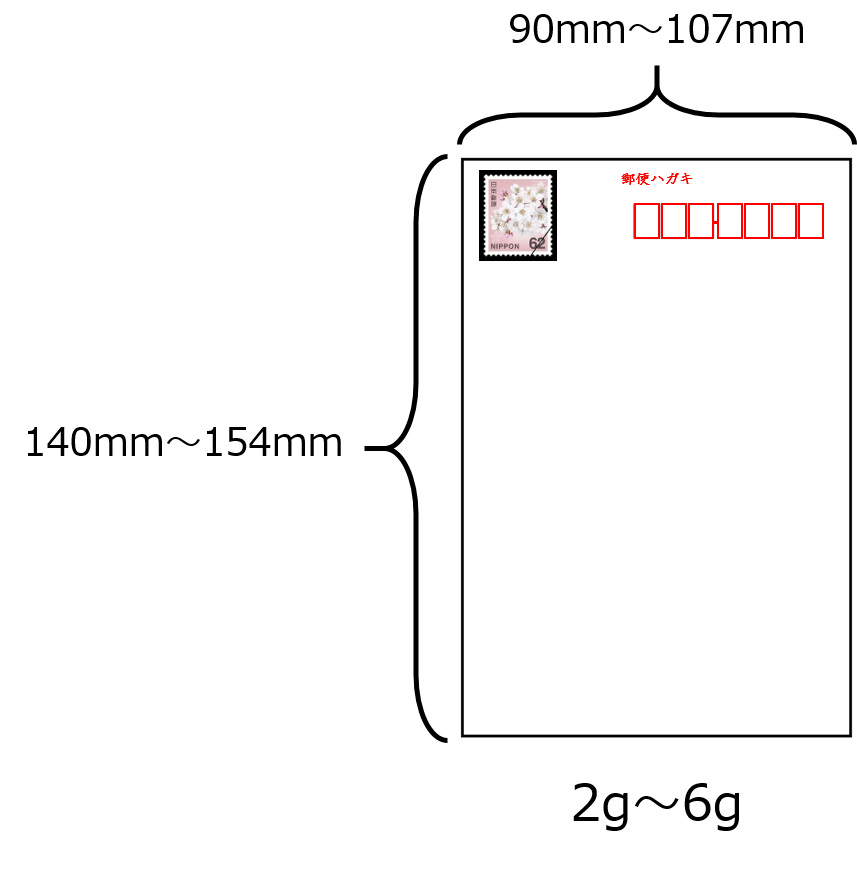 62円で送る条件として、重さ「2g~6g」、サイズ「最小90×140mm、最大107~154mm」に収めなければならないと決められています。