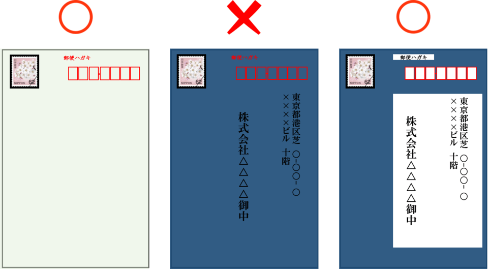 宛名がわかりやすいように、宛名面は白、もしくは淡い色にしなければなりません。濃い色を使っても、必要な記入事項の部分が見えるようにすれば問題はありませんが、違和感が残るので濃い色は避けるのが無難です。