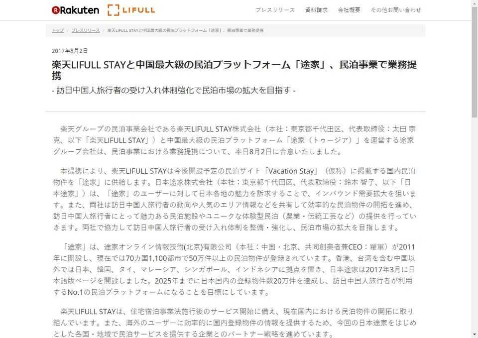 8月には、中国最大級の民泊プラットフォーム「途家」との連携を発表