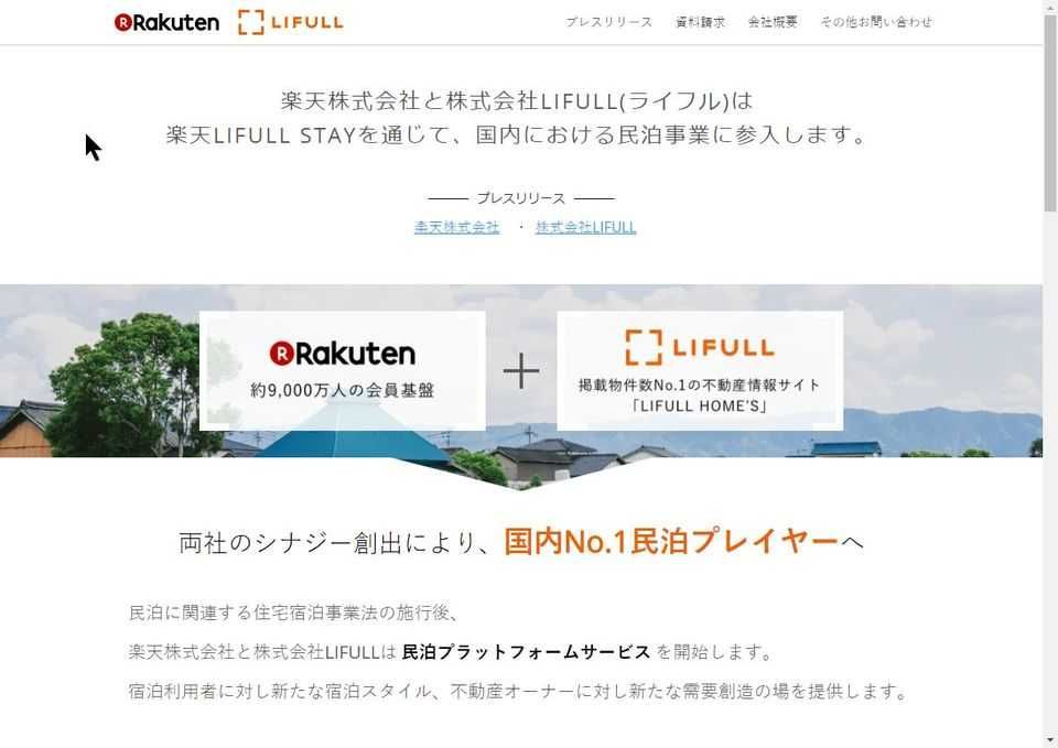 「国内No.1民泊プレイヤーへ」とうたう楽天LIFULL STAYのホームページ