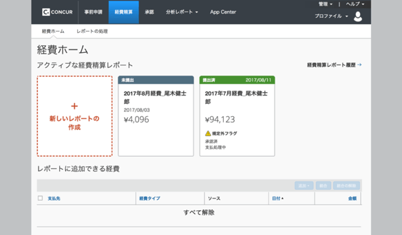 「Concur Expense Standard」PC版(ブラウザ)のホーム画面