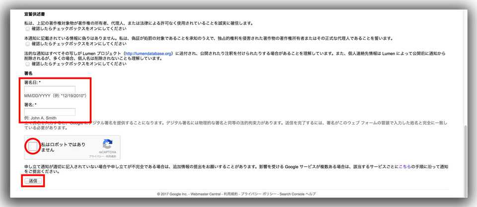 最後に、署名して送信します。申請できたかどうかは、Web上から削除用ダッシュボードで申請状況を確認できます。