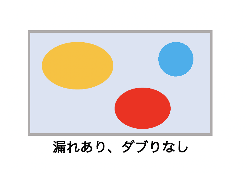 最後に、分類に漏れもダブりもあるパターンです。実は多くのビジネスシーンで、根拠となるデータに漏れやダブりがある状態で結論が出されているので注意が必要です。