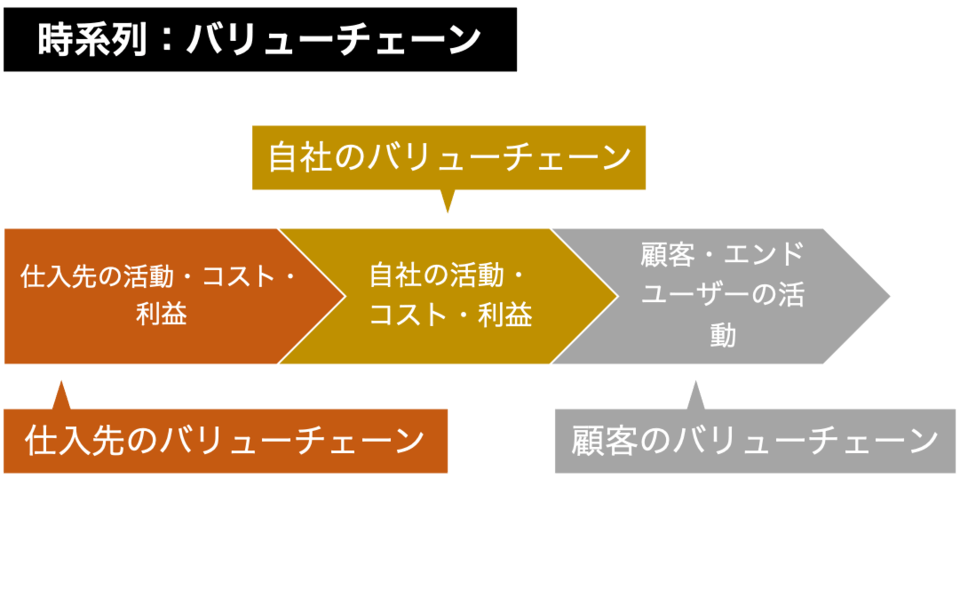 バリューチェーン(価値連鎖)とは、企業が顧客に提供する付加価値の構造を捉え再構築するためのフレームワークです。事業活動を一連の価値(バリュー)の連鎖(チェーン)として捉え、時系列・ステップ分けで行われます。