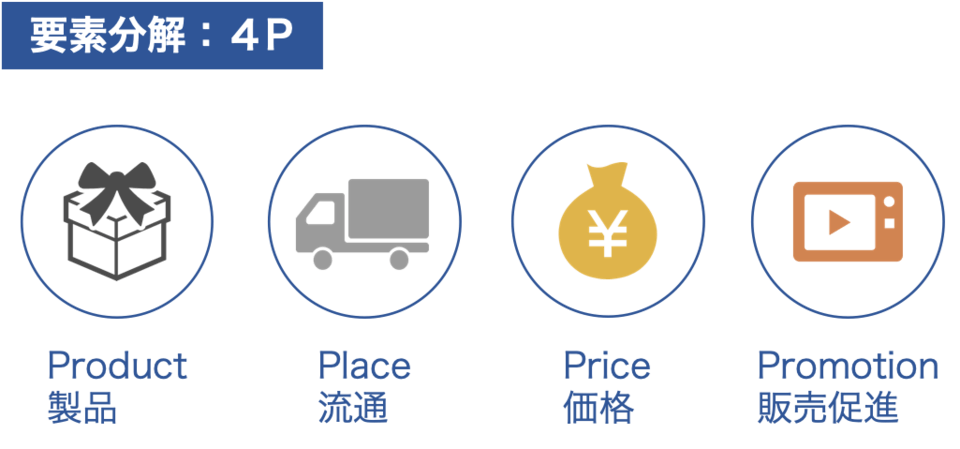 4Pとはマーケティングによく使われる要素分解の方法で、ものを売るときにどこに対して施策を行うかというヒントを得るために使われます。4Pはそれぞれ「P」から始まる次の4単語を指します。