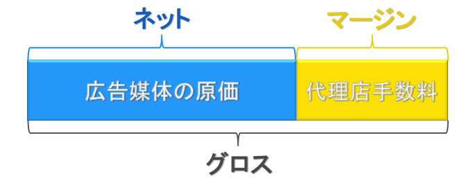 たとえば、手数料20%となる広告代理店の場合、グロス(総額10万円)に対して20%のマージン(手数料2万円)となるため、ネット(原価)は8万円となります。