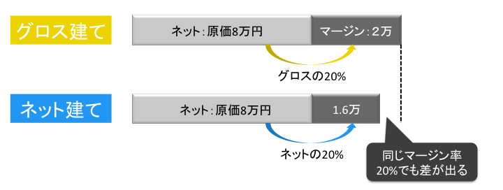 このような式になり、ネット(原価)が8万円となるのは、グロス(総額10万円)からマージン(手数料2万円)を差し引いた結果であることがわかります。