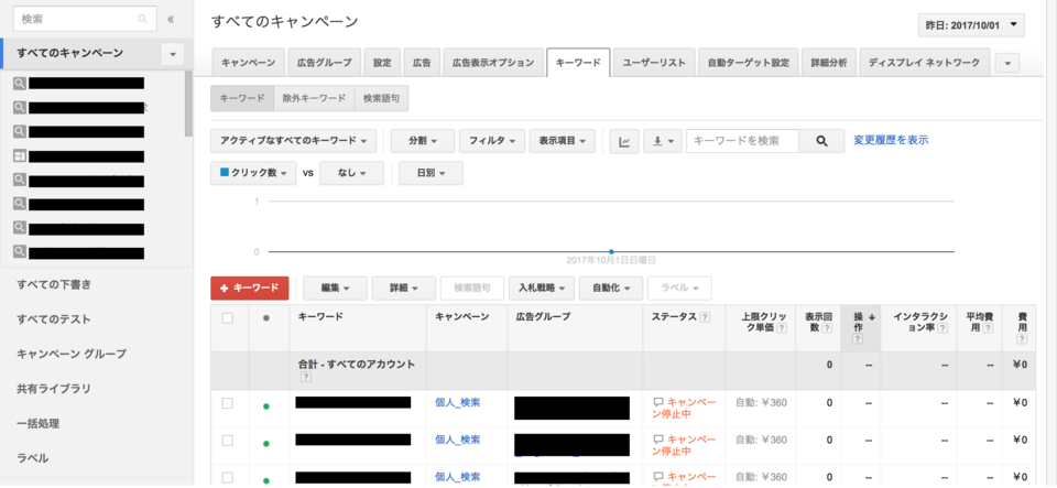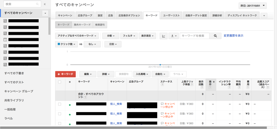 Googleアドワーズのアカウント。画面上部の「キャンペーン」→「キーワード」の順にクリック