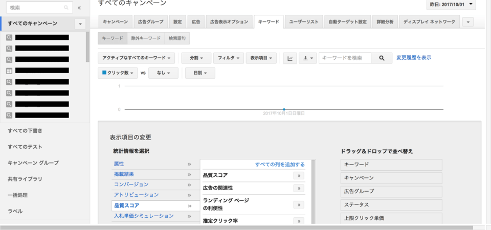 下記のような画面が出てくるので「品質スコア」をクリックして横の矢印マークを選択