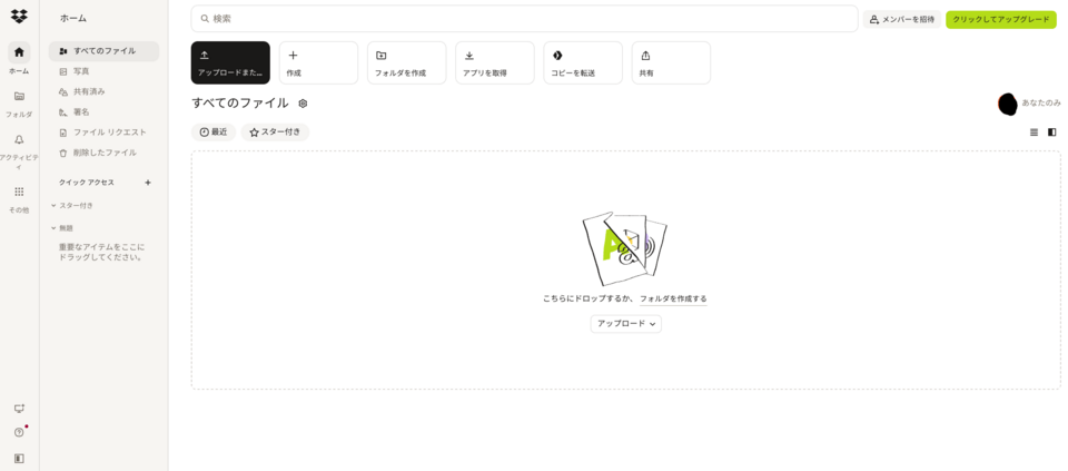 フォルダだけでなく、画像や、書類も同様にアップロード可能です。WebでDropboxにログインしてみても、フォルダがアップロードされたことを確認できます。ブラウザ版でログインしている場合も、ドラッグ&ドロップのみでアップロード可能です。