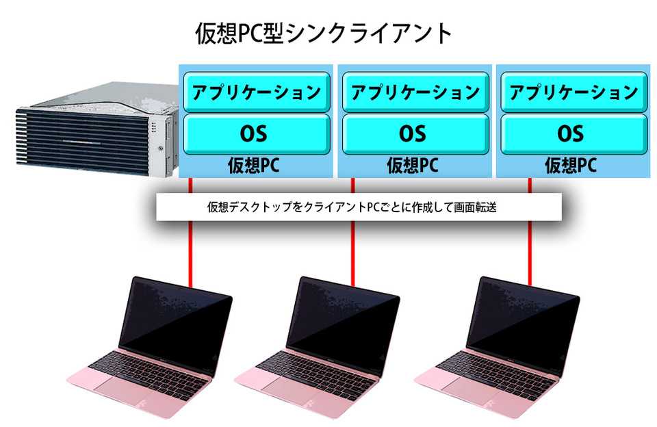 デスクトップ仮想型シンクライアントでは、複数の仮想デスクトップをもつ画面転送型の仕組みから、管理の容易さを保ちながら、個々のクライアント端末環境の独立性を確保できるメリットがあります。