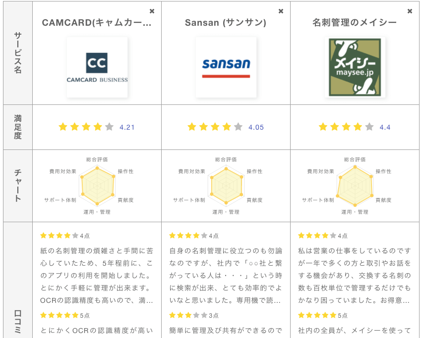 Sansan・CAMCARD・メイシーの評判(口コミ)を比較
