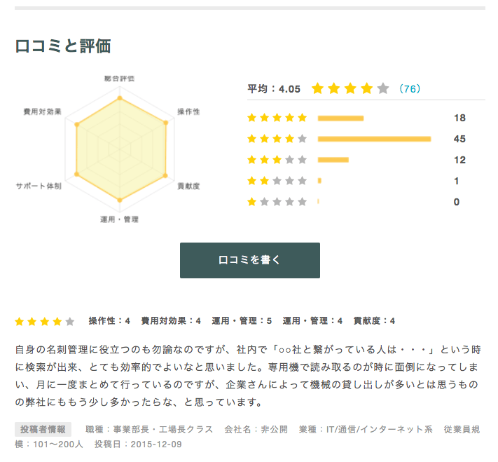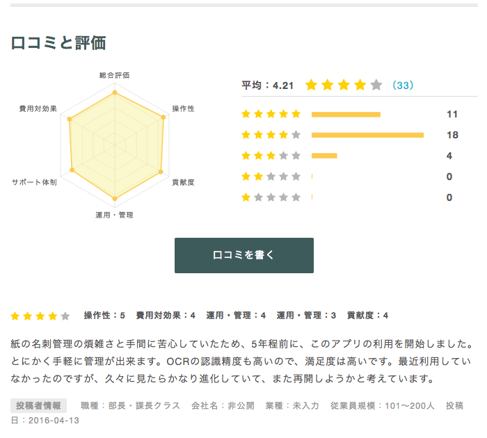 口コミは33件あり、平均4.21とこちらも高評価です。Sansanと比較すると価格が非常に抑えられる点も評価ポイントのようですね。SFA機能は少し弱めに感じる方もいるようですが、認識精度が非常に高く利便性を感じているポイントといえるでしょう。