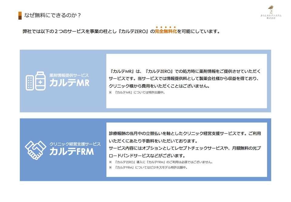 1つめは「カルテMR」だ。これは、カルテZEROでの処方時に薬剤情報を提供するというもの。情報提供料として製薬会社から収益を得ているため、電子カルテの費用がかからない。