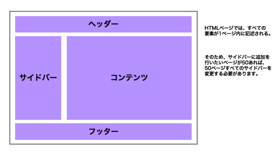 このため、ユーザーリクエストによって表示されるのは「個別のHTMLページ」となり、下図のような構成の場合、サイドバーに変更を加える際は、すべての該当ページを個別に修正する必要があります。