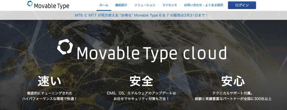 Movable Type は、オープンソースとしてスタートしつつも、現在は商用パッケージとして提供されているCMSです。多くのCMSが使用しているPHPではなく、Perlを言語として使用するのが特徴であり、コンテンツを静的HTMLとして書き出すことが前提となっているため、表示スピードの速さや強固なセキュリティ環境を実現しています。