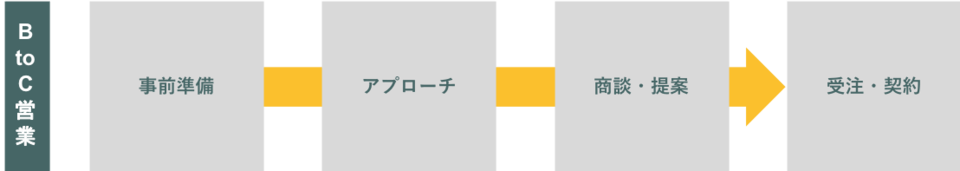 個人を対象としたBtoC営業の場合、「担当者=決裁者」であるため営業フローは次のようにシンプルです。