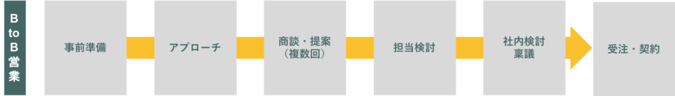 BtoB営業の場合、関係部門でどのようなメリットがあるのかを組織内で判断するため、個人向けの営業と比較してステップが増え契約までの期間は長くなります。また個人ではなく組織による意思決定になることから、感情による衝動買いは起きにくく、「どのような効果が得られるか」が重視されます。