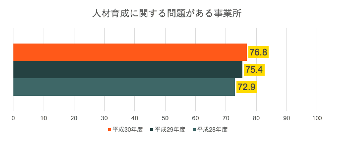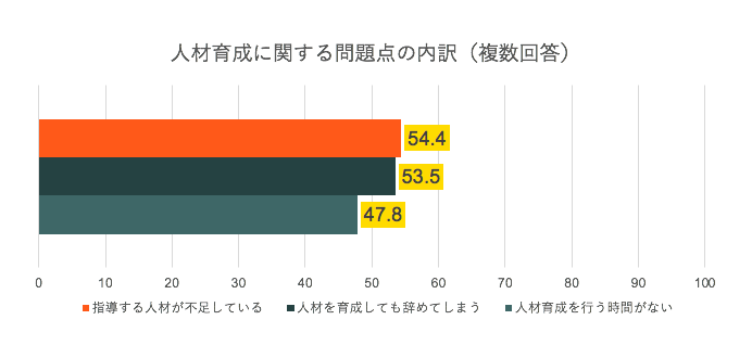 また、問題の内訳を見てみると、「指導する人材が不足している(54.4%)」や「人材育成を行う時間がない(47.8%)」という回答が上位を占めており、リソースの問題によって適切な社員教育や人材育成を実行するための体制が整備されていないことがわかる。