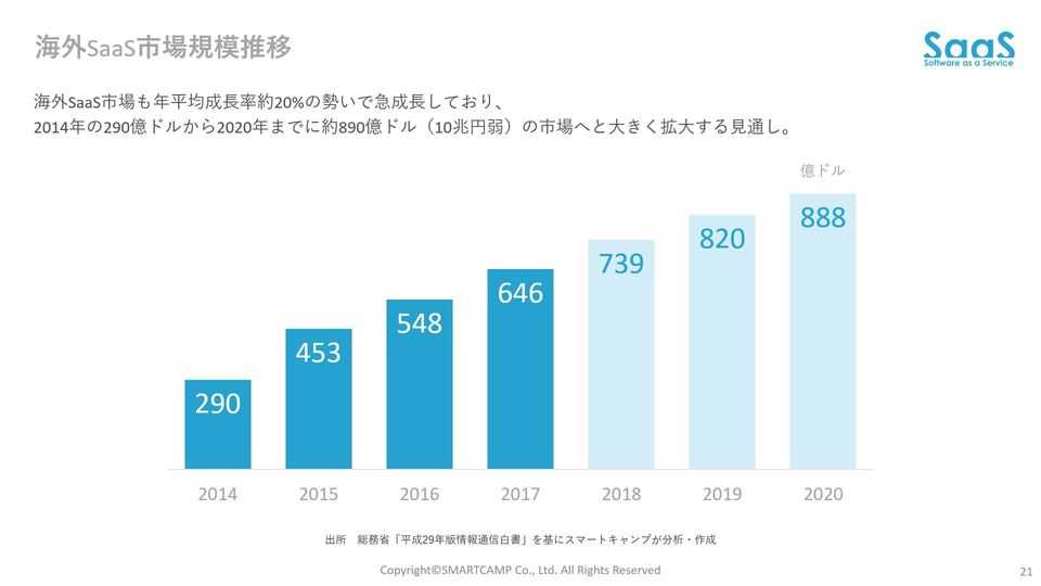 海外SaaS市場も年平均成長率約20%の勢いで急成長しており、2014年の290億ドルから2020年までに約890億ドル(10兆円弱)の市場へと拡大する見込みです。