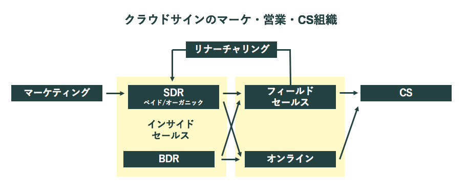 本題に入る前に、まずは2019年7月現在のクラウドサインの営業体制を解説しておきたい。下の図で示した通り、クラウドサインには、リード創出を目的とするマーケティングと、既存顧客の対応を担うCS(カスタマーサクセス)のほか、インサイド/フィールド/オンラインの3チームで構成される営業組織がある。