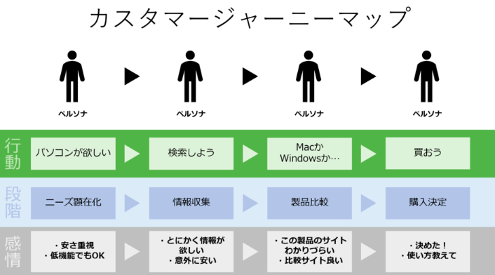 態度変容を促すためにはカスタマージャーニーを描き、どんな接点を持った場合にコンバージョンになるのかを意識する必要があります。