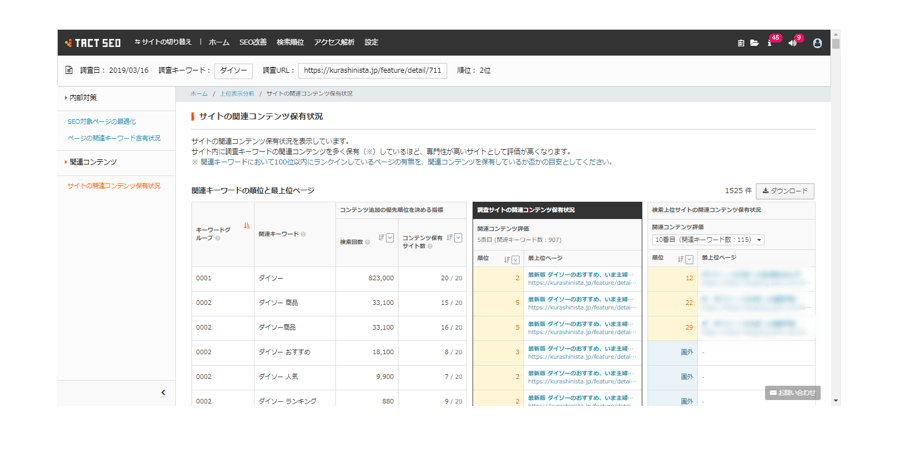 そのため、上位表示分析には「そのページに含むべき関連キーワード」「サイト全体で網羅しておくべきキーワード」を適切にグルーピングする機能があります。これにより一つのキーワードに対して一つのページを用意する必要がなくなり、より効果的なSEO施策が実行できます。