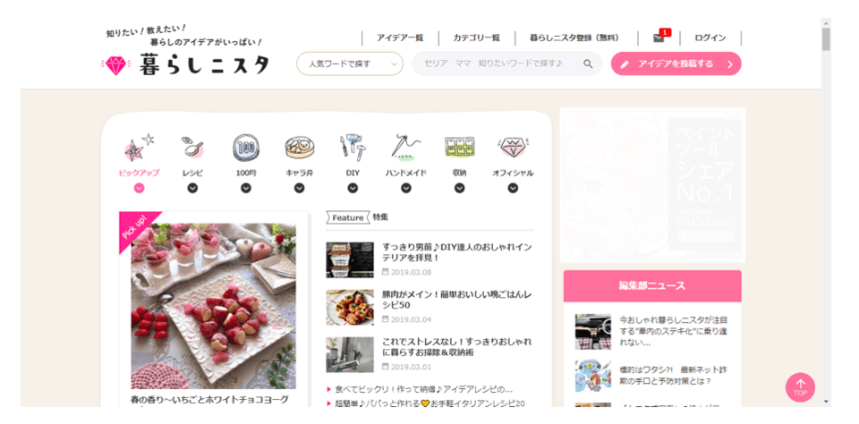 特に暮らしに関するアイデアを発見できるメディアである 「暮らしニスタ」 では、TACT SEOを活用し日々サイトの改善を繰り返すことで、「コストコ」をはじめ「ダイソー」「100均」「DIY」「キャラ弁」「時短レシピ」といった、主婦層に検索ニーズのあるキーワードで多数上位表示を達成しています。その結果、2018年12月時点で500万MAUを超える規模に成長しています。
