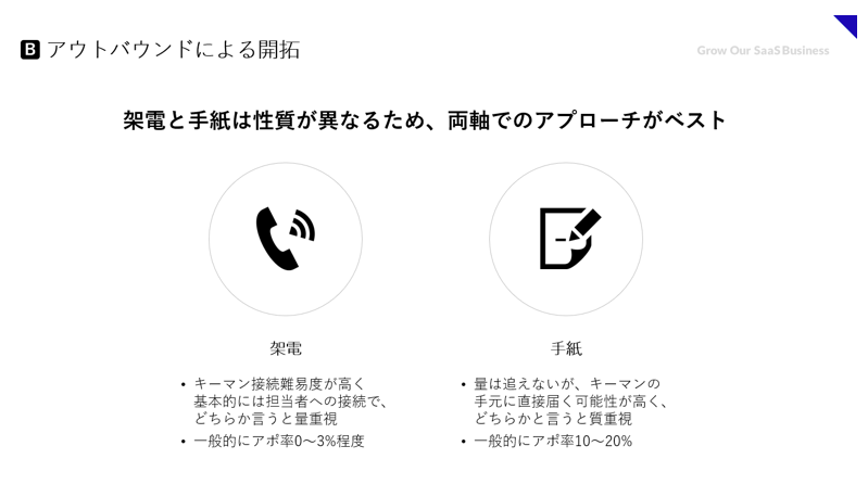 もう一つのアウトバウンドの手段として、デジタルマーケティングの時代になった今でも手紙は有効である。これはオンラインのメルマガと同じで、広告要素の強いものではなく私信として送るのがポイントだ。役員や部長宛てに届いた郵便物は、特に私信の場合仕訳段階で廃棄されるリスクは低く、また手元に届いた際に「何だろう?」と開封してもらえる可能性が高い。あとは、手紙を送った背景やアポイントのメリットなどを送り先に合わせて記載するなど、中身を工夫する。