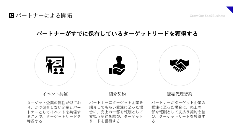 パートナーを活用した開拓の具体的な施策として、イベントの共催、紹介契約、販売代理契約の3つについて取り上げたい。まずイベント共催は特別な契約が必要になるわけではないため、手軽に始められるパートナー施策の一つだろう。ターゲット企業の属性が似ており、かつ競合しない企業とイベントを共催することで、互いにターゲット企業のリードを獲得できる。