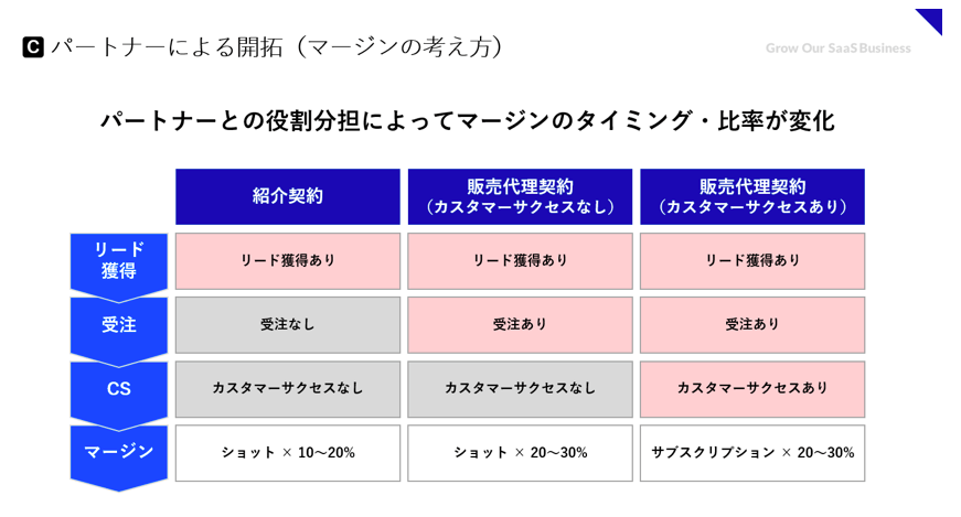 ただし、金銭的なインセンティブを設ける契約を結ぶ場合、マージンの設定が非常に重要になる。マージンが少なければ強いインセンティブにならず、紹介や代理販売が行われなくなってしまうからだ。特にSaaSの場合サブスクリプションモデルのため、それぞれがどこまで担うのかによってマージンの考え方が大きく変化する点に注意する必要がある。