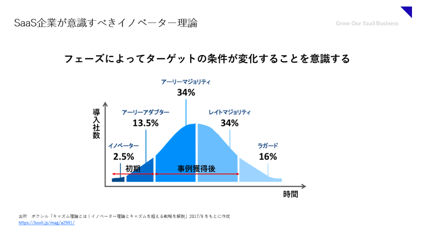 一方、ITリテラシーが低く、積極的に新しいサービスを導入するカルチャーではない企業はレイトマジョリティかラガードに当たり、新しいSaaSの導入ハードルが高く、また導入しても効果が出なければすぐに解約してしまうためSaaSの初期フェーズのターゲットとしては適切ではない。このような企業には、事例獲得後にアプローチしていくべきだ。