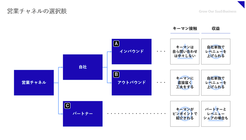営業戦略の要となる営業チャネルは、インバウンド、アウトバウンド、パートナーの3つの選択肢があるが、営業チャネルによってキーマンへのアプローチのしやすさも変化する。キーマンは自ら問い合わせせず担当者クラスに問い合わせを任せることが多いためインバウンドでの接点構築は難しく、直接的にアプローチするのであればキーマンに狙いを定めてアウトバウンドやパートナーチャネルを活用するのが有効だ。