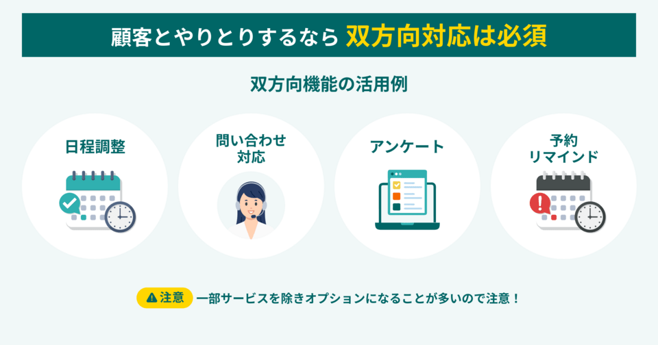 双方向でのSMS通信(送受信)が可能なサービスも数多く提供されています。オプションではなく標準機能として双方向でのSMS通信ができるツールは下記のとおりです。