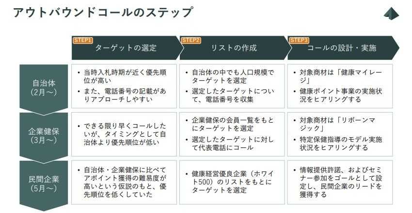 具体的には、アウトバウンドコールを2~5月にかけて3段階にわけて実施しました。自治体は4月から入札がはじまるので、優先順位が高いところからスタートしたというわけです。次に、3月に優先順位の高い健保にコール。そして5月に民間企業という流れです。