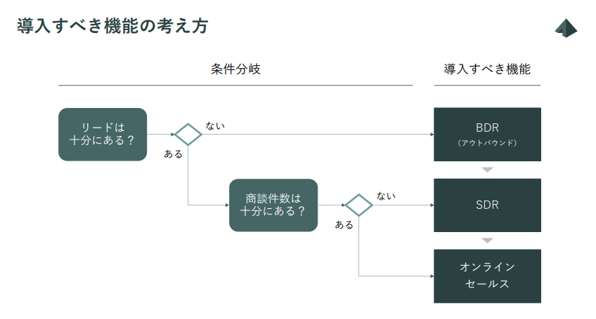 まず、リードと商談件数が十分にないと、オンラインセールスをやる理由はそもそもないですよね。リードがないのであれば、まずはリードを取りに行く。商談件数がないのであれば、商談を作るためにSDRのプロセスを設けるべきだと言えます。