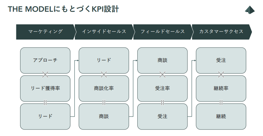 まず、基本としてこの「THE MODEL」を頭に入れておいてください。THE MODELは、セールスフォース・ドットコムが提唱した組織営業のベストプラクティスモデルで、マーケティングからカスタマーサクセスまでを各部門ごとに分担し、それぞれがKPIを持ちながら売上目標達成のために連携をはかっていく手法です。