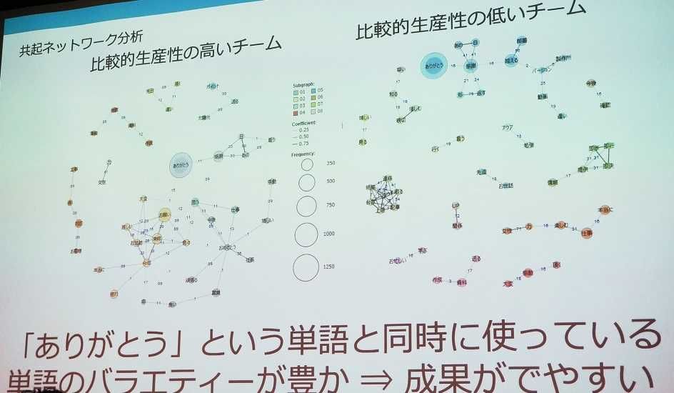 鈴木:はい。感謝の気持ちを伝えるツールですので、「ありがとう」という言葉が当然多くなります。そして**「ありがとう」という言葉に紐づく語彙が多ければ多いほど、生産性が高い**という結果が出ています。生産性が高いというのは、エンゲージメント・サーベイ(Q12・キュートゥエルブ)から計測した結果です。