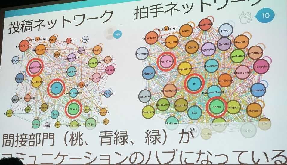 鈴木:これはUniposから生まれたコミュニケーションネットワーク図で、定量的に分析しました。丸が大きくなればなるほど、コミュニケーションが豊かな部署ということになります。