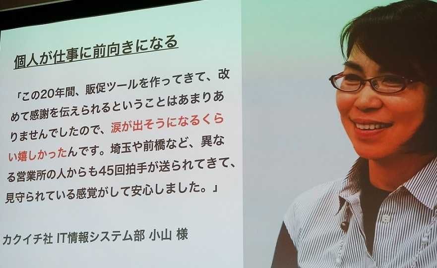 鈴木:はい、こちらはIT情報システム部の小山さんという方です。これまで小山さんは、販促物やチラシを作る仕事を20年間続けてきました。拠点が離れていますから、なかなか現場の方から感謝されることがなかった。