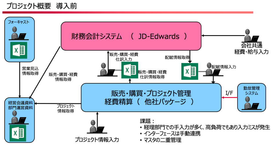 プロジェクト開始前、同社では財務会計システムにオラクルの「JD-Edwards」を、販売・購買・プロジェクト管理や経費精算システムには他社のパッケージを利用していた。インタフェースで直接つながっているのは勤怠管理システムのみで、財務会計システムは分断されており、営業見込みのフォーキャスト(予測)などもExcelで行っていた。とはいえ、この状態でも経営情報や財務情報はなんとか取得できていたという。