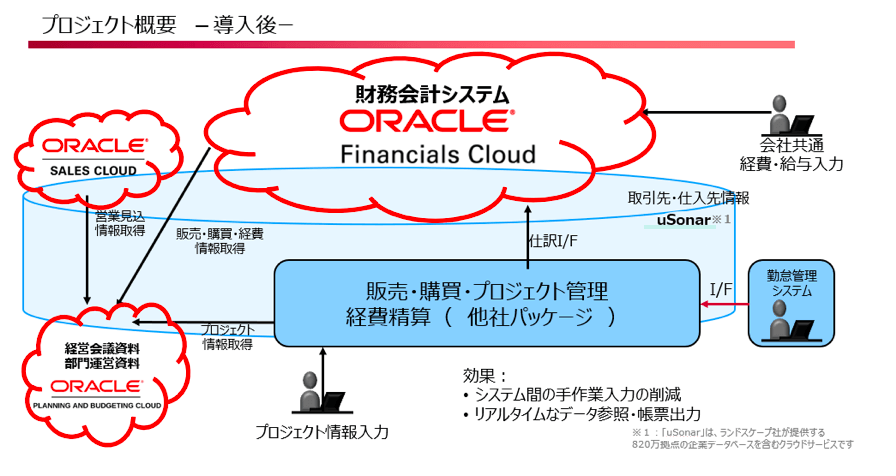 財務系では、オラクル「ERP Cloud – Financials」により、財務会計データとプロジェクトの予実データなどを連携することで、収益管理を実現。実工数も1人あたり5時間/月の削減効果があった。帳票出力についても、時間をかけずに最新データの出力が可能になった。
