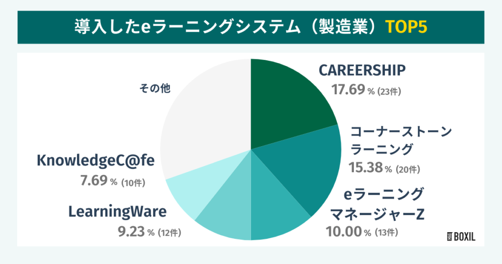 BOXILのアンケート※によると、利用が最も多かったeラーニングは「CAREERSHIP」で17.69%、次いで「Cornerstone Learning」が15.38%、「eラーニングマネージャーZ」が10.00%でした。